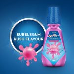 Goût Bubblegum Rush. Retrouvez le même délicieux goût de bubblegum, maintenant disponible en bain de bouche. Le bain de bouche Bubblegum de Crest Kids nettoie les zones inaccessibles à la brosse à dents. Sans alcool et à base de fluor, ce bain de bouche offre la protection efficace contre les caries que vous attendez de Crest. Spécialement conçu pour les enfants de 6 ans et plus.